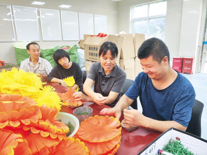 荊門市圓夢殘疾人庇護工場內(nèi),孟麗華(右二)正教殘疾朋友進行手工制作。